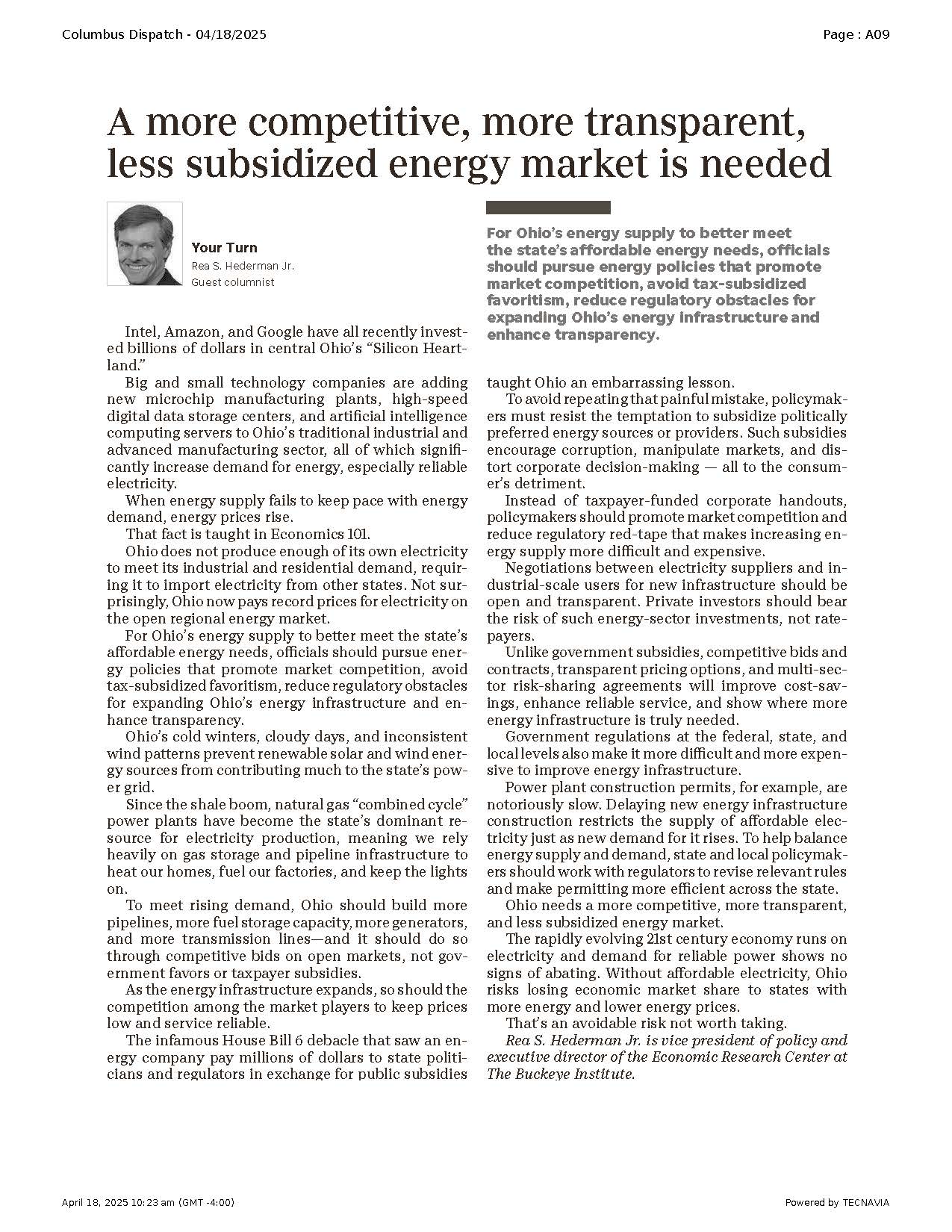 “With the signing of House Bill 15, Ohio is now a national leader in smart, free-market energy policy. While more work remains to ensure cost transparency and protect consumers from overpaying for costly infrastructure, The Buckeye Institute-championed policies are pro-consumer and pro-business—ending costly, uncompetitive subsidies, bringing back greater predictability in public utility rate cases, and incentivizing new energy development.”