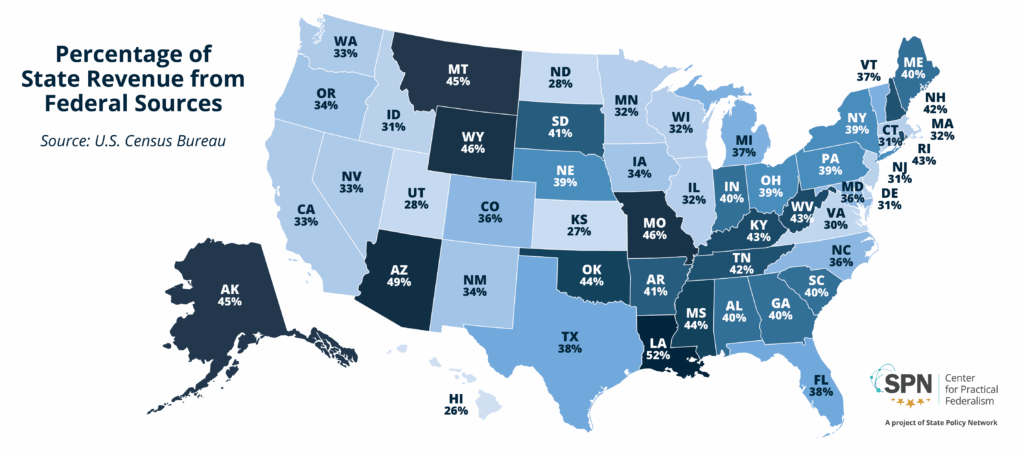 A new policy brief from State Policy Network’s Center for Practical Federalism finds that the average state now relies on the federal government for 37% of its revenue, double what it was in 1990.